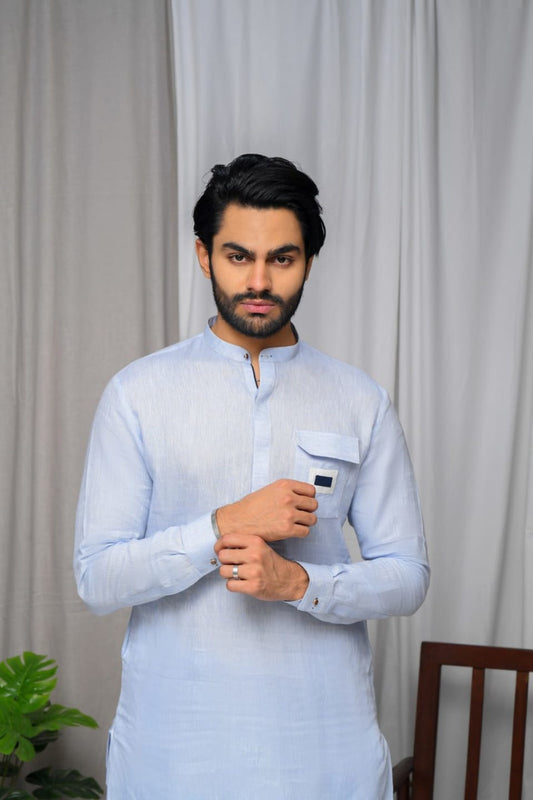 Sky Blue Linen Flap Pocket Kurta Trouser.