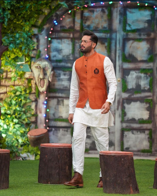 White Embroidered Kurta Trouser with Rust Waistcoat.