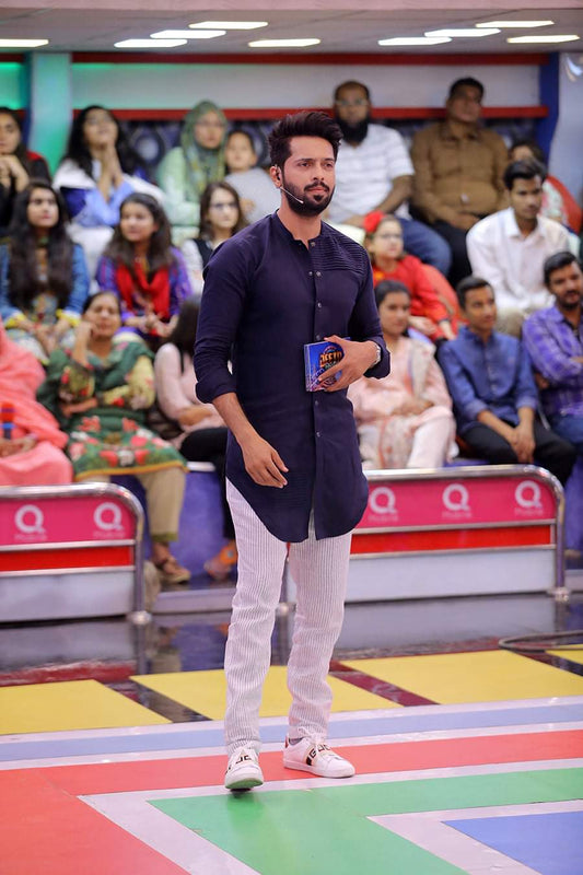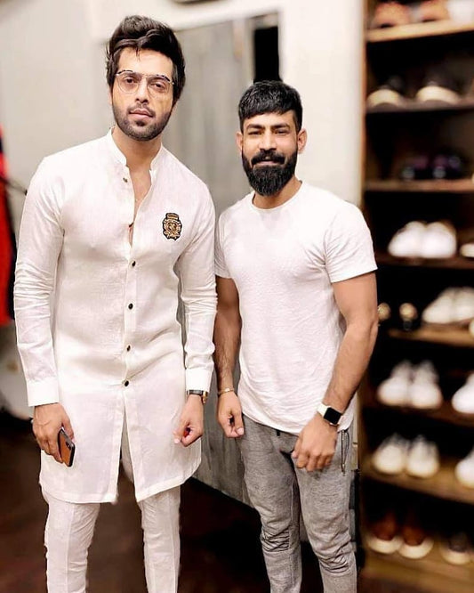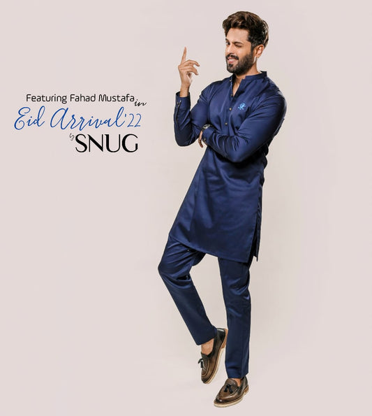 Fahad Mustafa Signatured Kurta and Shalwar with Embroidered Linen Non-Fused blazer By Snug