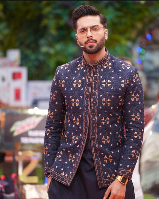 Navy Blue Embroidered Prince Coat