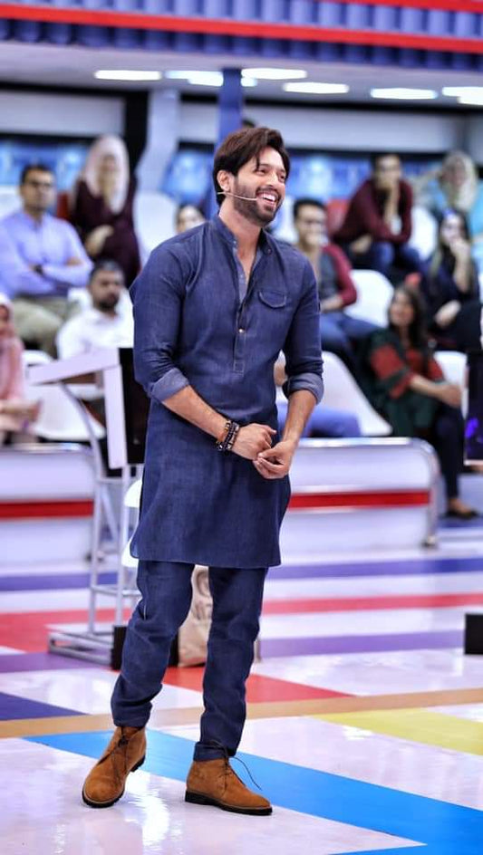 Fahad Mustafa's Trend: Denim Kurta & Striped Trousers!
