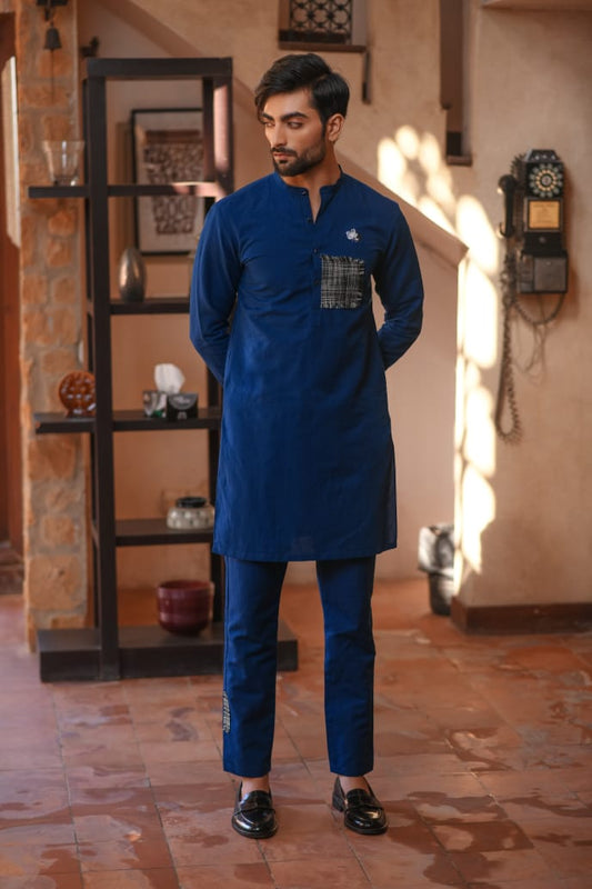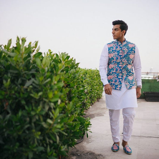 Aqua Embroidered Long Waistcoat with Paisley Kurta Trouser